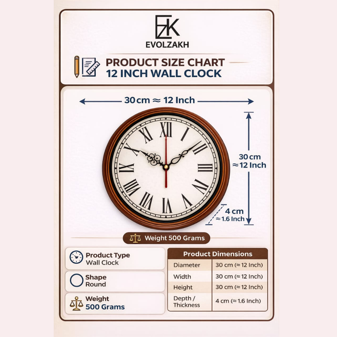 The Evolzakh 12 Inch Vintage Wooden Wall Clock features a premium dark walnut wooden frame, classic Roman numerals, and decorative metal hands for a timeless look. Powered by a reliable quartz ticking movement, this elegant analog wall clock offers accurate timekeeping while enhancing the décor of living rooms, bedrooms, offices, and other interior spaces.