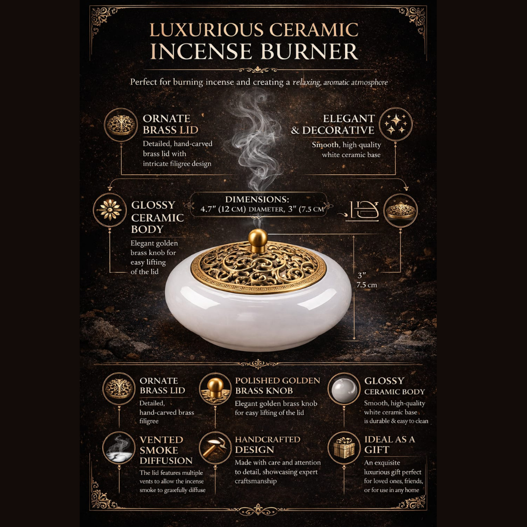 Bring a sense of calm, tradition, and refined elegance into your space with the Evolzakh Premium White Glazed Jade Incense Burner. Crafted with a glossy glazed ceramic body and beautifully carved brass lid, it enhances both fragrance diffusion and visual appeal. Its manual, non-electric design supports bakhoor, loban, dhoop cones, incense sticks, and coils—making it perfect for daily worship, meditation, yoga, and festive occasions. The compact, heat-resistant build ensures safe, long-lasting performance while adding a premium decorative touch.