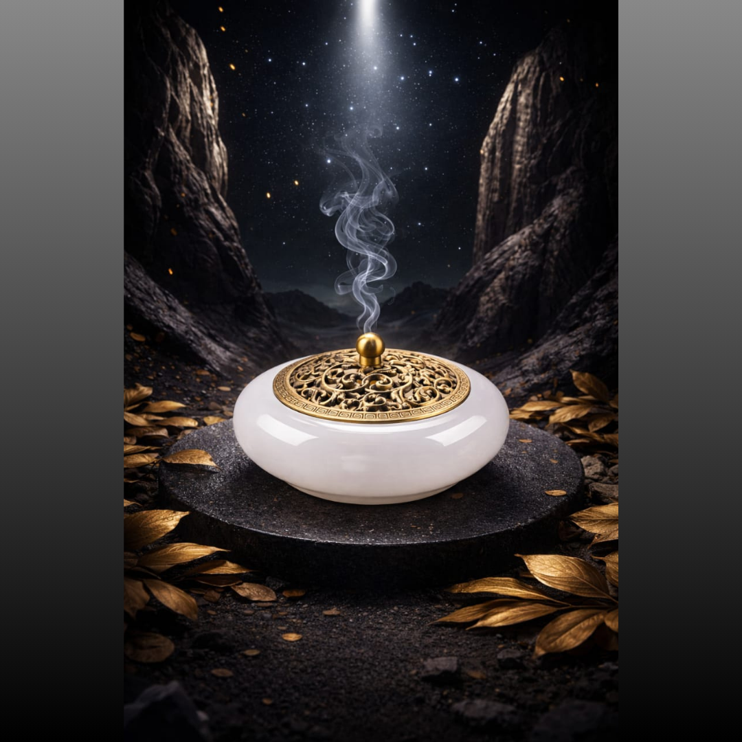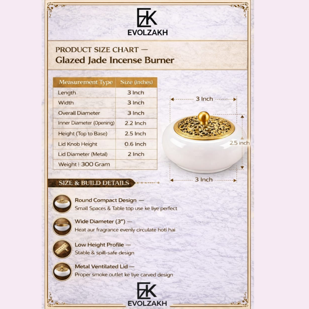 The Evolzakh Premium White Glazed Jade Incense Burner is crafted from high-quality glazed ceramic with a decorative brass lid for elegant fragrance diffusion. This non-electric, heat-resistant burner is suitable for bakhoor, loban, dhoop, incense sticks, cones, and coils—perfect for daily puja, meditation, relaxation, and spiritual use at home or office.