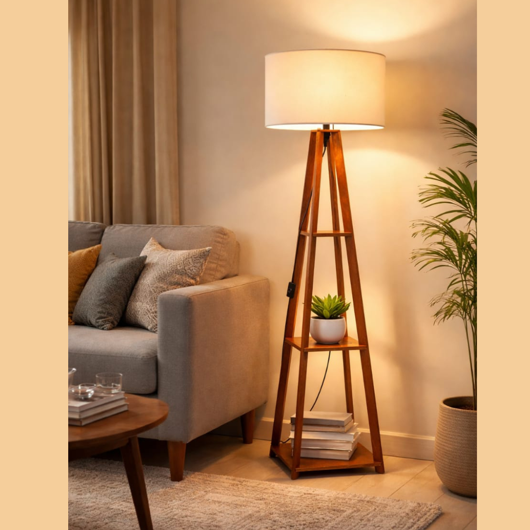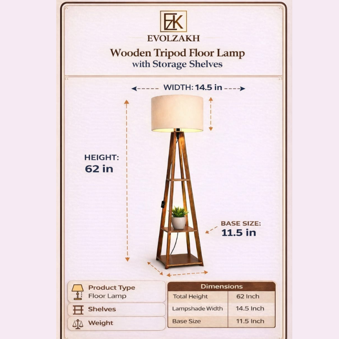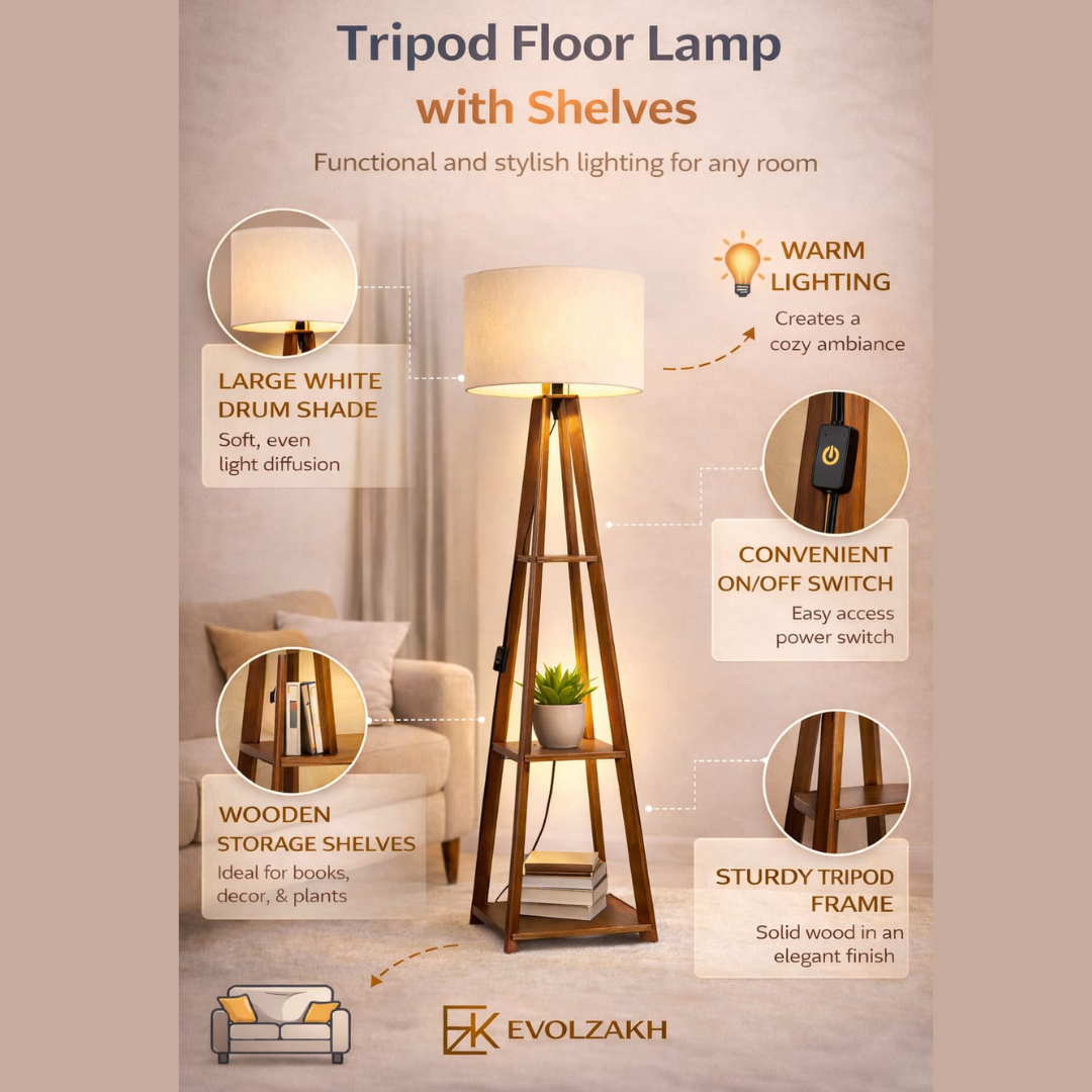 The Evolzakh Wooden Tripod Floor Lamp with Storage Shelves is a perfect blend of elegant lighting and smart storage. Crafted from solid wood with a premium walnut brown finish and paired with a large white fabric drum shade, it delivers soft warm ambient lighting. Built-in wooden shelves provide space for books, décor, or plants, making it an ideal choice for living rooms, bedrooms, study rooms, or reading corners.